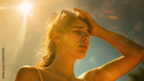 portrait of tired sick exhausted woman, beautiful girl is suffering from hot Summer heat stroke, sunshine, hot weather day, sweaty and thirsty, high temperature.