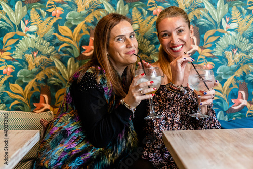 Portrait of two adult women enjoying cocktails at restaurant table