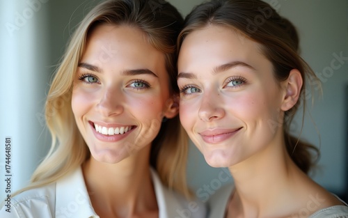 Portrait of two cheerful young women. Two beautiful young women with perfect skin in the studio. Skincare facial treatment, beauty salon. High quality