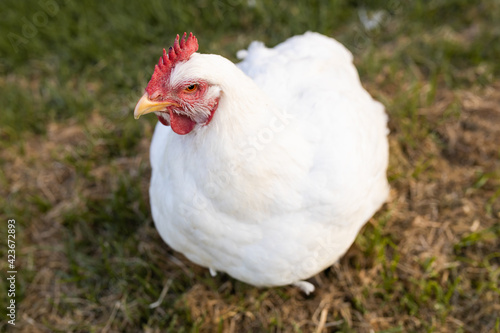 portrait of white broiler chicken (Gallus gallus domesticus) full body looking at the camera, free range chicken on chicken farm
