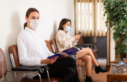 Portrait of woman in face mask sitting at hall in office, waiting for business meeting during coronavirus pandemic