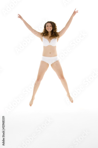 woman, missy, jumping, smiling, lingerie, overweight, underclothing, arms outstretched, beauty, happiness, studio shot, 20s, caucasian, cheerful, colours, colours, comfortable, confident, content, copy space, cut-out, front view, full-length, image, jump, one person, studio, 20s, vertical, young adult, panty, bra, beautiful, pretty, attractive, happy, busty, curvy, fit, healthy, active