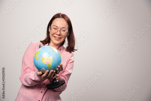 Portrait of woman looking on an Earth globe on a white background