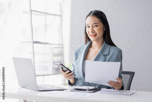 Portrait of young Asian businesswoman in suit, woman smiling and work at workplace inside office, accountant with calculator behind paper phone signing contracts and financial reports