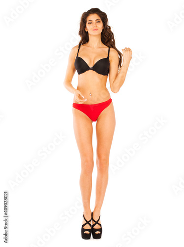 bikini, isolated, model, slim, attractive, white, pant, red, adult, fit, studio, glamour, people, 1, black, caucasian, female, fashion, posing, shoe, lingerie, cute, portrait, lady, wearing, heel, bra, girl, young, drawer, underpants, face, sensual, standing, woman, person, long, beauty, friendly, elegance, style, cheerful, underclothing, beautiful, wear, brunette, sexy, full-length, full body