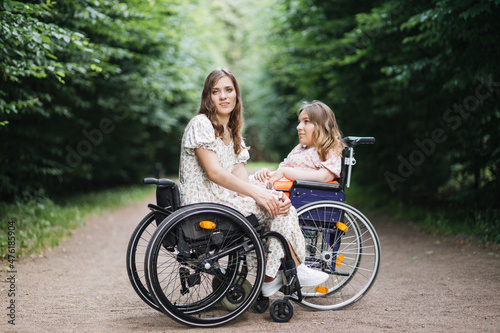 Portrait of young caucasian ladies in wheelchairs sitting in front of each other at summer park and looking at camera. Concept of people with disability and lifestyles.