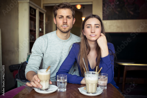 young, couple, cafes, milk, froth, lip, people, fun, copy space, adult, woman, man, mouth, curious, togetherness, bizarre, conformity, serious, caucasian, teenage, casual attire, latte, macchiato, humor, leisure, funny, drinking, sitting, table, lifestyle, water, glasses, unusual, female, human relationships, male, white, hot drink, drink