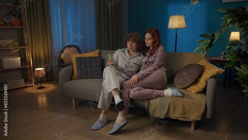Portrait of young couple spending time together. Man and woman in pajamas sitting on the sofa, holding smartphone and watching something.