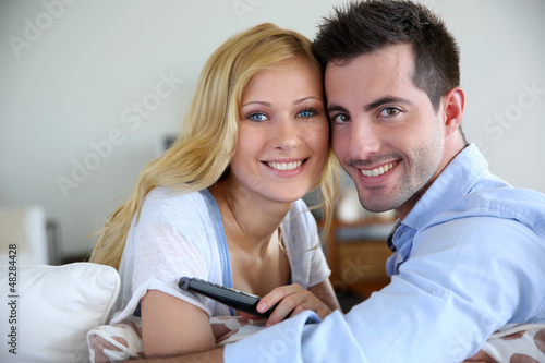 Portrait of young couple watching tv