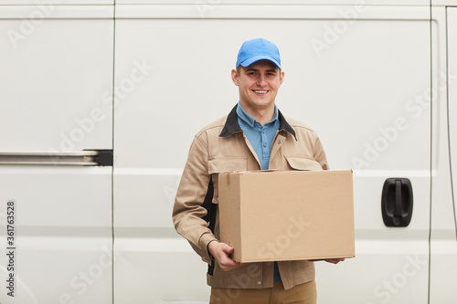 Portrait of young courier smiling at camera while carrying the box outdoors