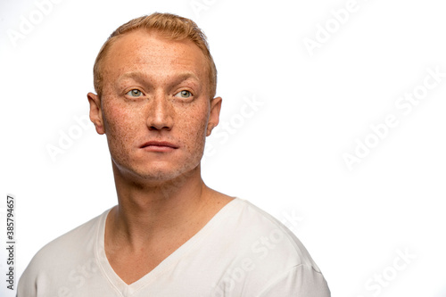 redhead, portrait, natural, one person, closeup, copy space, looking, adult, one man only, casual attire, expression, beauty, adult, confident, white background, people, white, shirt, casual clothes, facial expression, freckled, human face, individuality, freckle, human nose, human mouth, studio shot, slim, studio, horizontal, real people