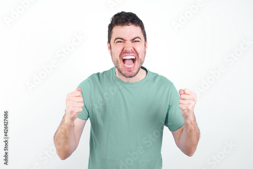 Portrait of young handsome caucasian man wearing green t-shirt against white wall looks with excitement at camera, keeps hands raised over head, notices something unexpected reacts on sudden news.