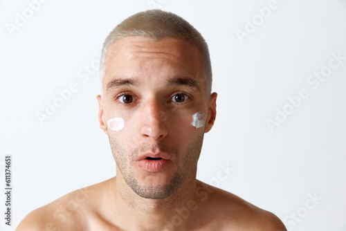 Portrait of young handsome man taking care after skin with moisturizing cream against white studio background. Concept of men's beauty, skincare, cosmetology, spa, health. Copy space for ad