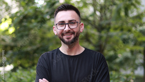 Portrait of young handsome man with beard and glasses. Young man in black shirt smiling looking at camera. Outdoor nature background