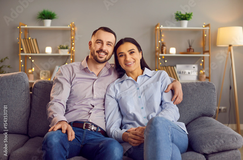 Portrait of young happy married couple sitting on sofa in living room at home. Smiling family man and woman on couch hugging and looking at camera. Harmonic relationships and Valentines day concept.