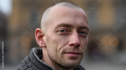Portrait of young man with bald hair.