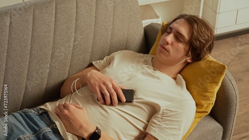 Portrait of young person in the room enjoying free time. Man laying on the sofa in earphones listening to music, calm expression closed eyes.