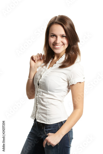 adult, attractive, beautiful, beauty, bright, brown, brunette, candid, cosmetic, creativity, cute, elegance, expression, face, fashion, female, girl, hair, coiffure, head, human, isolated, looking, make-up, model, modern, 1, person, portrait, pose, posing, sensuality, shoulder, skin, student, studio, style, styling, stylish, symbol, woman, young, jean, white, shirt, chemise