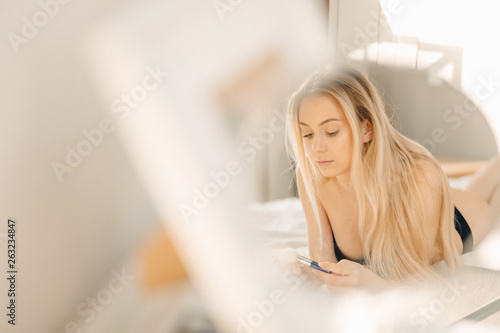 Portrait of young sensual blonde woman enjoying her time in bed, happy morning at home.