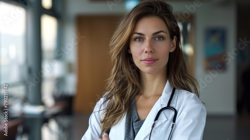 Portrait of Young Spanish Female Doctor, White Lab Coat and Stethoscope