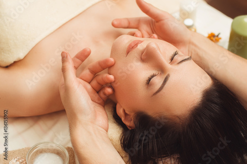 Portrait of young woman enjoying face massage. Closeup of beautiful woman relaxing under professional masseur hands. Body care, beauty, oriental spa, pleasure, resort concept