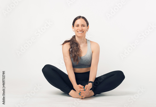 Portrait of young woman sitting in lotus position on floor enjoying workout