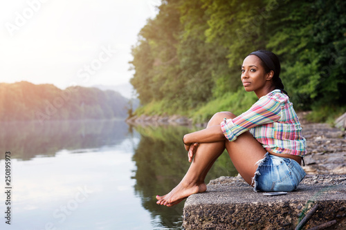horizontal, outdoors, day, portrait, half face, full-length, one person, us, pennsylvania, relaxation, hiking, contemplation, short, casual clothes, barefoot beach, ponytail, black hair, river bank, river, tree, forest, vacation, smiling, headband, us, north america, central america, america, american, pa, relaxing, concept, hiker, rambler, rambling, trekking, contemplate, contemplating, contemplative, concept, clothing, shoeless, barefoot, feature, dark hair, river bank, waterway, wood, timberland, timberland, holiday, smile, grin, smile, outside, afternoon, daylight, daytime, portrait, eye contact, 20s, 20s, youngster, woman, female, young adult, 20 years, missy