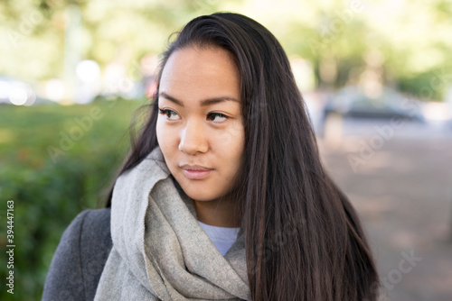 portrait, woman, muffler, people, asian ethnicity, asian, long hair, park, adult, smiling, brunette, outdoors, waist up, beauty, horizontal, 1, optimism, positive, looking away, colours, front view, missy, real people, foulard, sweden