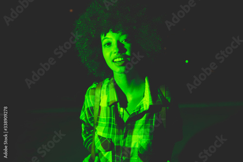 one person, missy, front view, standing, night, light, checked, leisure, afro, copy space, italy, portrait, curly, casual attire, outdoors, individuality, lifestyle, style, dark, piercing, artificial light, smiling, green, joy, people, adult, woman, young adult, shirt, pattern, coiffure, jewellery, colours, photo, color image, style
