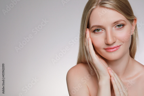 background, light, happy, woman, female, person, face, caucasian, space, copy, text, portrait, adult, young, hand, hair, pretty, naked, honed, beauty, care, skin, model, clean, make-up, fresh, beautiful, fashion, spa, up, cosmetic, lifestyle, natural, healthy, colours, clear, sexy, blond, touch, pure, health, constructed, facial, attractive, soft, beige, sensuality, studio, lady