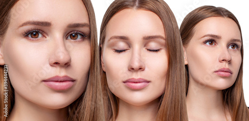 woman, girl, young, studio, collage, caucasian, face, female, beautiful, isolated, fashion, portrait, looking, eye, clean, sensuality, head, front, sensual, health, three, attractive, glamour, 1, healthy, natural, nationality, beauty, pure, cute, nature, fair hair, skin, make-up, pretty, skincare, care, fresh, honed, white background
