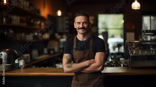 Portrait photograph of barista cafe employee standing behind bar