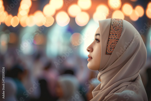 Portrait side view of young Asian Muslim woman wearing traditional hijab, bokeh city lights at night as background