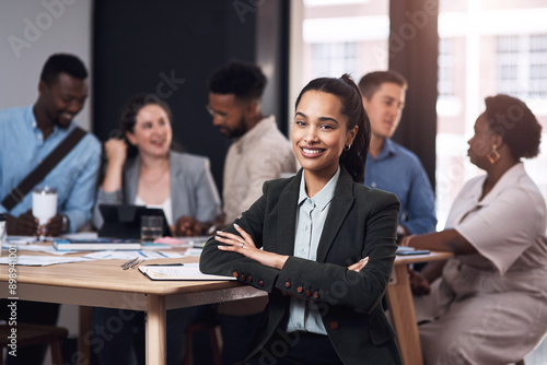 portrait, smile, business, woman, face, office, team, meeting, confident, professional, book, job, manager, leader, employee, arms crossed, notebook, pride, info, female, young, people, happy, group, adult, education, person, table, together, suit, desk, men at work, corporate, training, clothes, learning, study, formal, colleague, boardroom, collaboration, company, joy, entrepreneur, financial, workplace, workshop