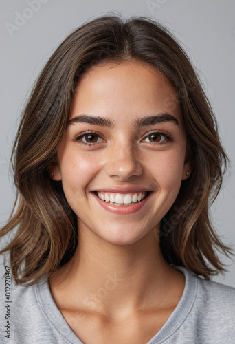 Portrait view of a regular happy smiling Portugal girl, ultra realistic, candid, social media, avatar image, plain solid background