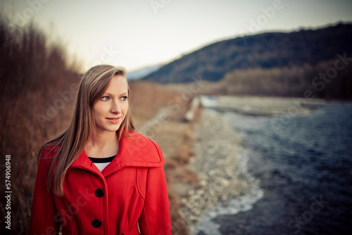 blonde hair, british columbia, canada, coat, day, front view, horizontal, landscape, long hair, looking away, mountain, mountain chain, one person, outdoors, portrait, portrait, real people, red color, river, scenic, straight hair, calmness, tranquil scene, waist up