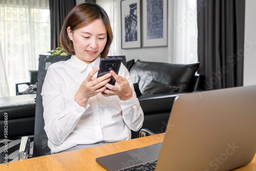 Portrait.Young woman happy pretty business woman student sitting at desk at home office with laptop computer looking at camera advertising online learning,business webinars.