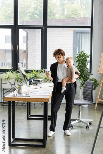positive businesswoman holding smartphone and little child near work desk in modern office.