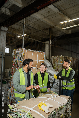 Positive indian worker in protective vest using digital tablet and talking to colleagues while standing near waste paper on hand pallet truck in waste disposal station, garbage sorting concept