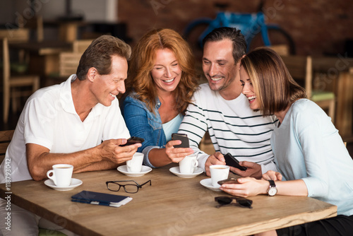 friends, together, modern, smile, hold, wearable, phone, technology, happy, digital, hot drink, cup, waist, up, cheerful, daytime, mobile, happiness, screen, friendly, look, indoor, male, laugh, sincere, touch, colleague, friendship, circle, mood, relax, fun, free, time, funny, conversation, talk, to sit, show, speak, atmosphere, watch, video