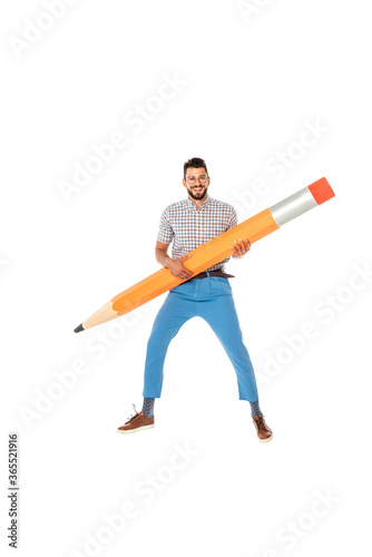 Positive nerd in eyeglasses smiling at camera while holding huge pencil isolated on white