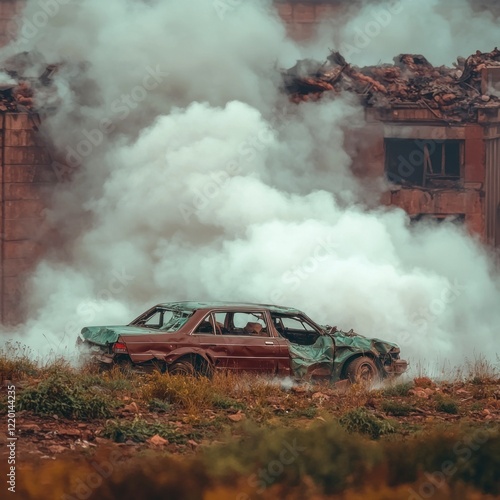 Post Apocalyptic Scene Wrecked Car Smoking Ruins Chaos