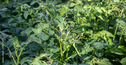 Potato bugs on foliage of potato in nature, natural background, close view.