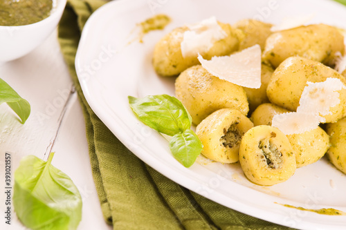 Potato gnocchi stuffed with pesto sauce.