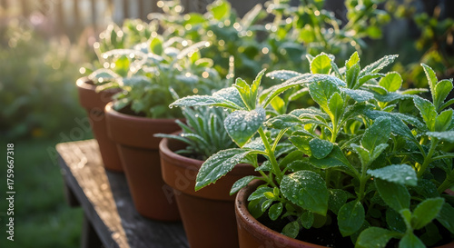 Potted herbs on an outdoor bench glistening with morning dew in a garden setting