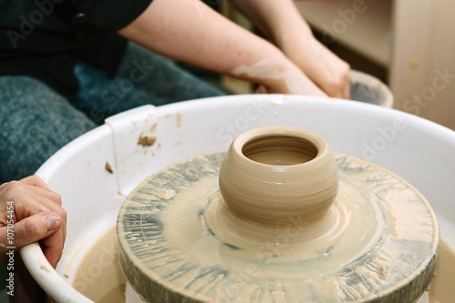 pottery. the teacher teaches the student work on the potter's wheel.