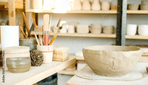 pottery, clay, tool, workshop, artisan, craft, hand-made, ceramic, art, studio, bowl, sculpture, creation, process, design, texture, earth, natural, material, work in progress, lighting, soft light, warm colors, brown, beige, grey, still life, table, background, detail, object, arrangement, tidy, organised, creative, hobby, occupation, artist