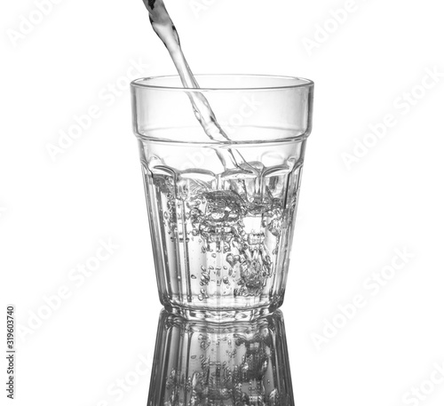 Pouring clean drinking water on a transparent glass. For health concepts. Isolated white background