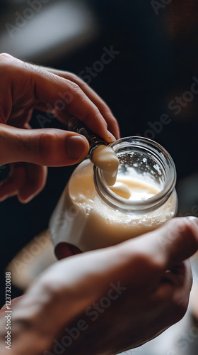 cream, jar, glasses, pouring, hand, metallic, utensil, beige, light, substance, closeup, food, dairy, thick, texture, smooth, white, liquid, container, cooking, preparation, process, ingredient, receipe, dairy product, homemade, natural, healthy, fresh, wholesome, spoon, metal, creamy, appetising, delicious, culinary, kitchen, food preparation, pour, fill