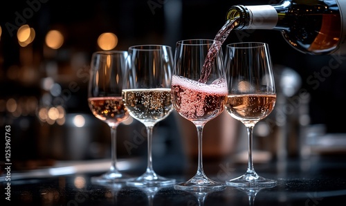 Pouring Wine Into Various Glasses In A Dark Bar Setting